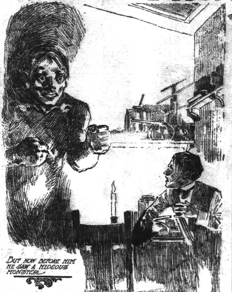 Illustration of Frankenstein and his monster, taken from an abridged version of Mary Shelley’s novel, appearing in the The Cincinnati Enquirer, January 16, 1910.