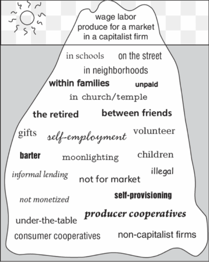 Inspired by feminist economic theory, J.K. Gibson-Graham proposed an iceberg image to suggest how much of “the economy” actually subsists outside of formal markets, remaining largely invisible and treated as inconsequential. The behaviors enumerated by the illustration below suggest how much economic work takes place in non-monetized forms, outside of wage labor and production for capitalist markets. These robust circuits of value-creation, often marginalized by standard economics and finance, can be seen in the generativity of living systems with sufficient organization: ecosystems of diverse organisms, agroecological farming, permaculture practices, online communities of collaboration, mutual aid networks, gift economies such as blood banks, scholarly disciplines, and artistic circles, timebanking collectives, and so on. Their contribution to “the economy” is enormous, but it is typically understated or ignored.