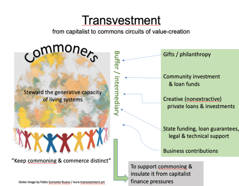 Because nature and modern economics have very different ontological and operational dynamics, there is a critical need for intermediary bodies for investment, to bridge and respectfully navigate those differences. It’s also important to name the value-shift that occurs when money is transferred from capitalist circuits of value to commons-stewarded regimes of value and meaning. We call this transvestment to indicate that investment in the latter value-regime has very different logics (holistic, ecological, social, ethical) than that of conventional capitalist investment. We will return to both of these topics – intermediary bodies and transvestment –  in Section 5.